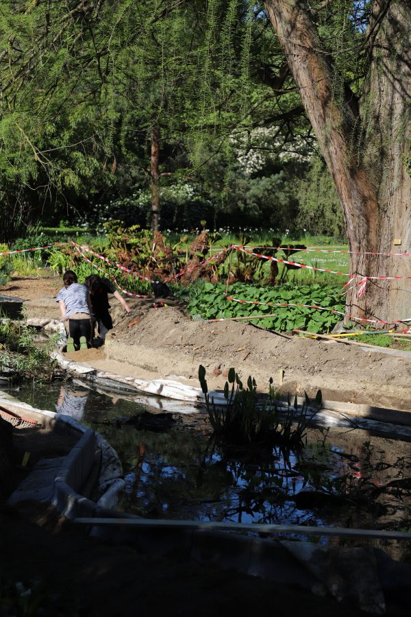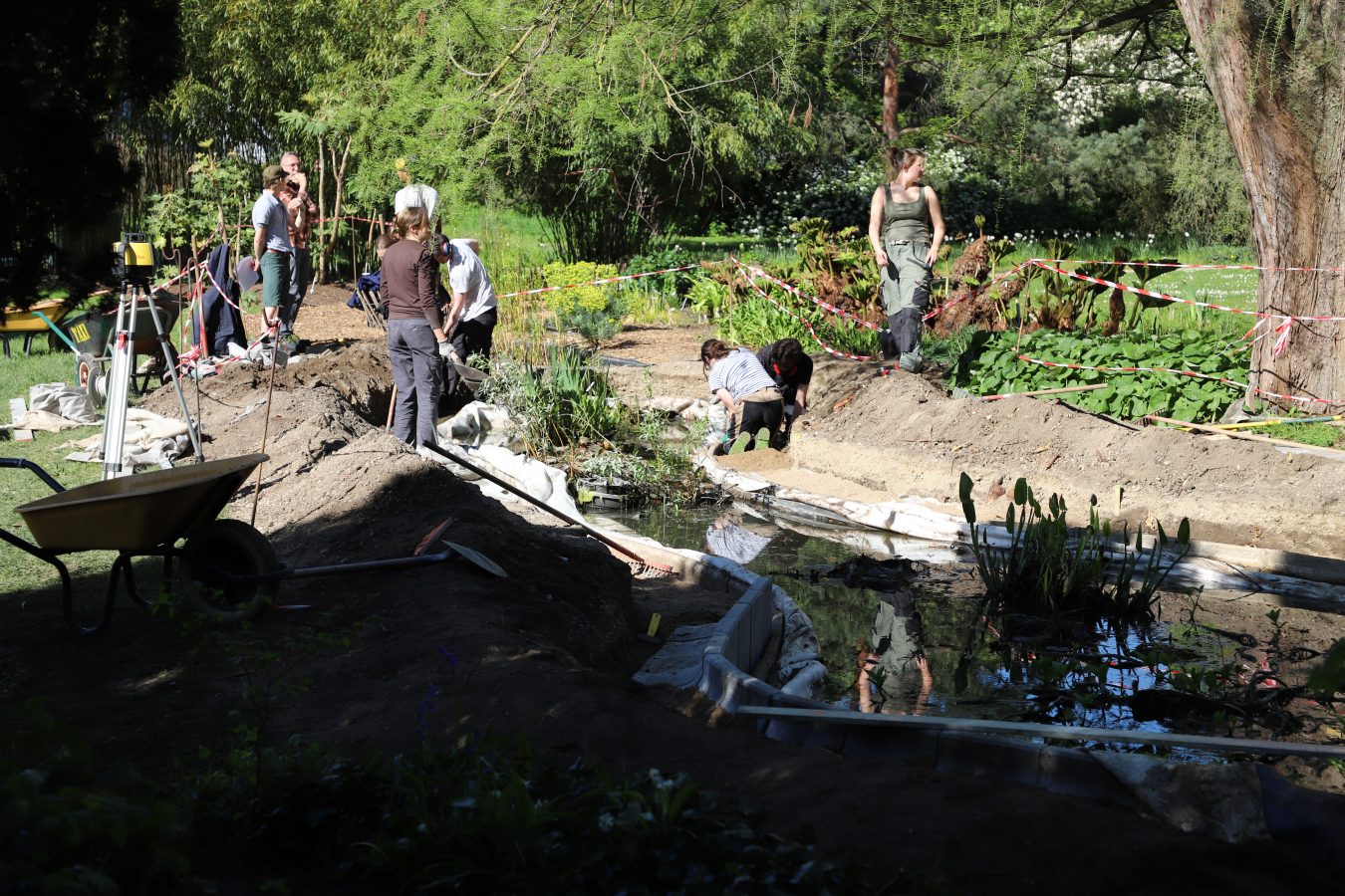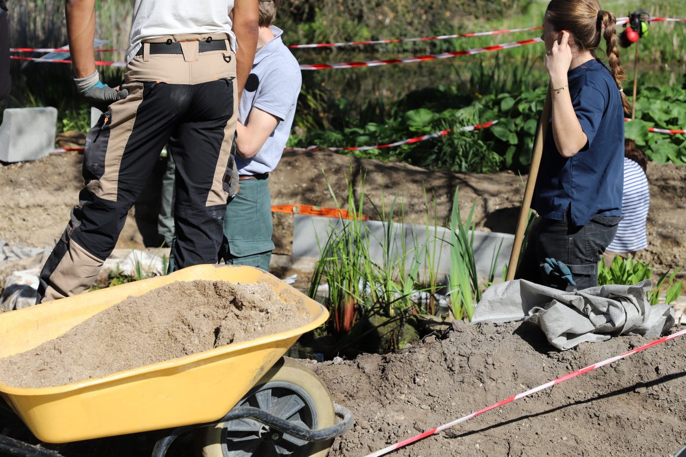 La dégradation des anciennes berges impose la pose de blocs préfabriqués en béton et l’installation d’une bâche de stabilisation. Une contrainte majeure s’ajoute : la mare est bordée d’un cyprès chauve, dont les pneumatophores — ces excroissances racinaires qui permettent à l’arbre de respirer — doivent être préservés. Les étudiant·es doivent donc adapter leurs gestes et leurs choix techniques pour protéger ces organes fragiles.