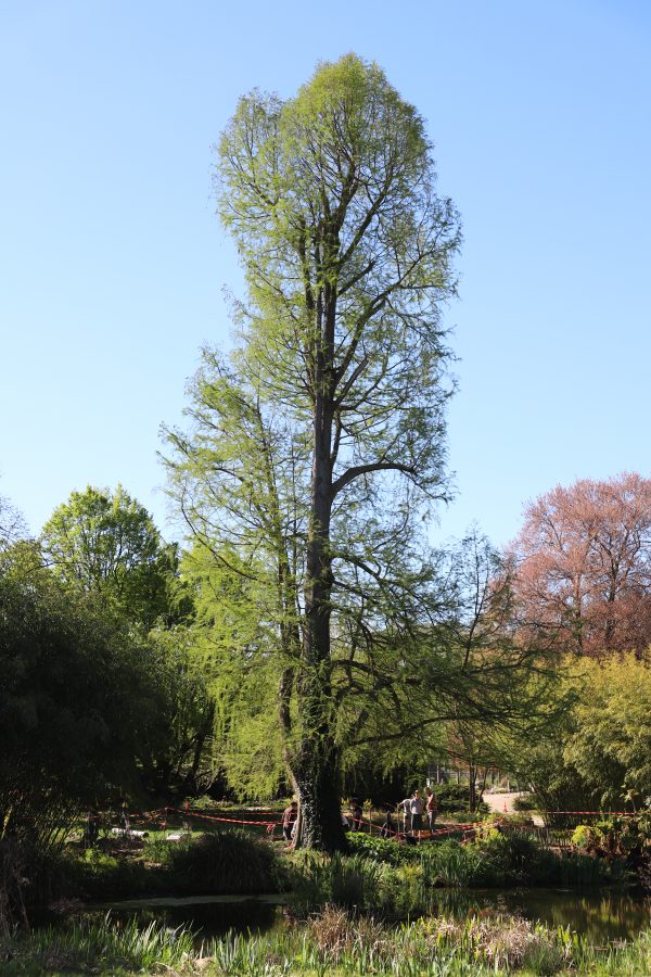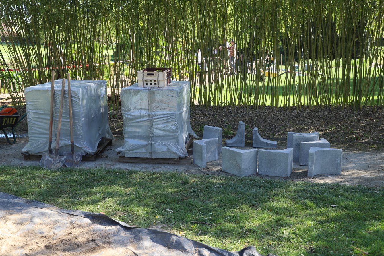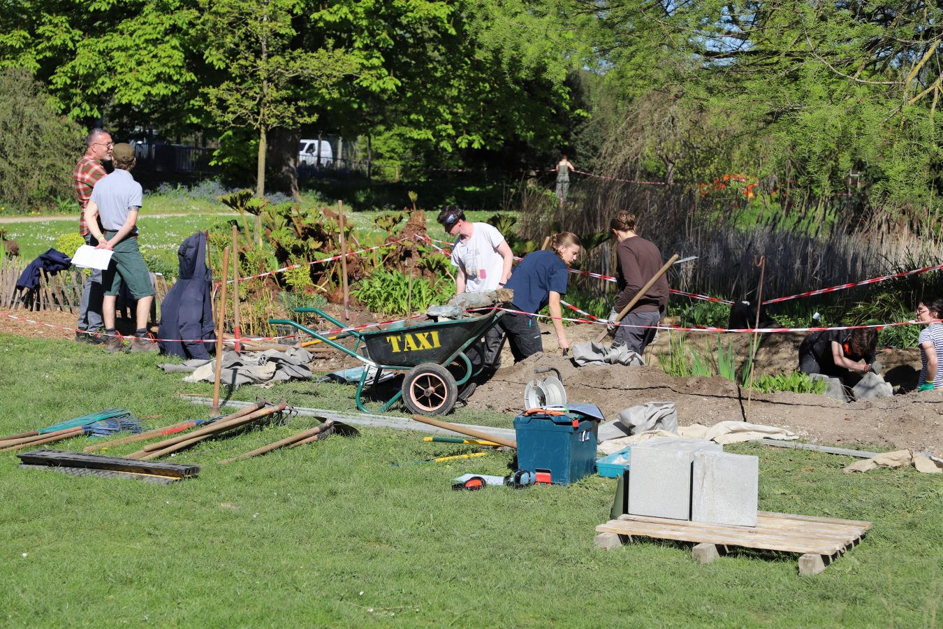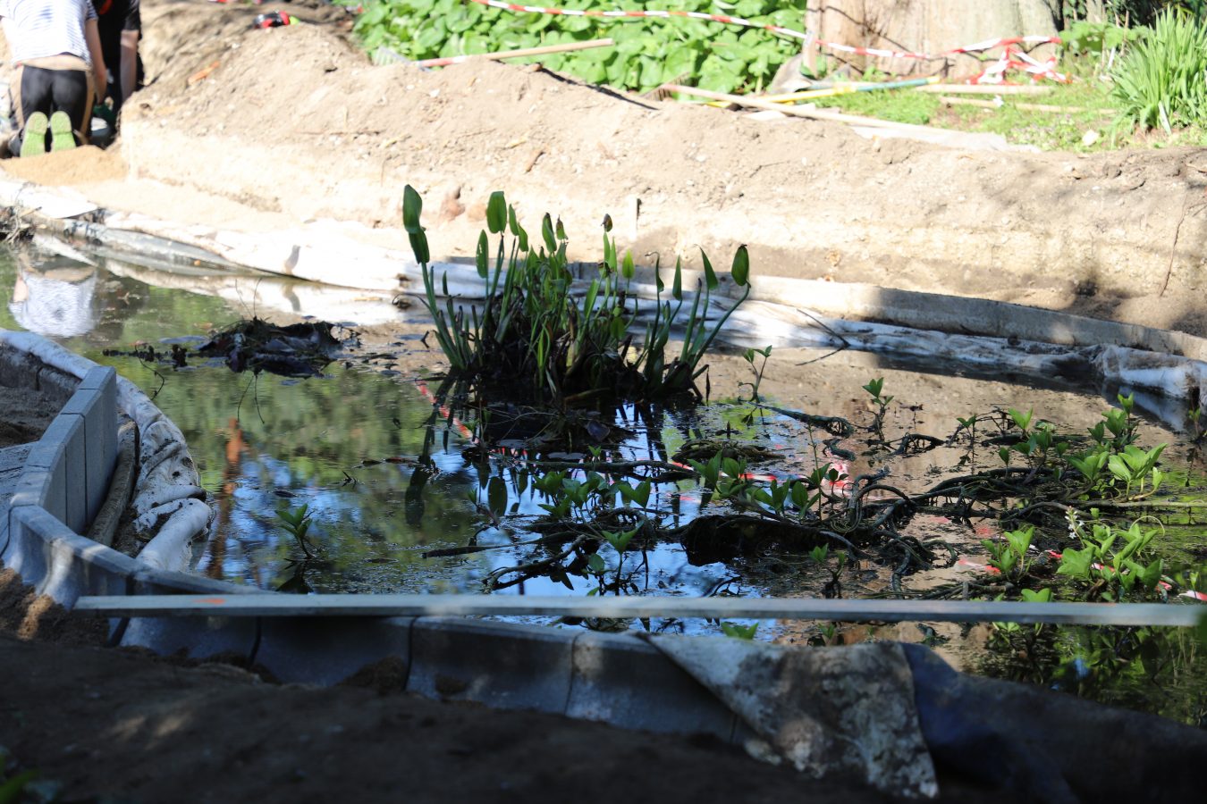 La dégradation des anciennes berges impose la pose de blocs préfabriqués en béton et l’installation d’une bâche de stabilisation. Une contrainte majeure s’ajoute : la mare est bordée d’un cyprès chauve, dont les pneumatophores — ces excroissances racinaires qui permettent à l’arbre de respirer — doivent être préservés. Les étudiant·es doivent donc adapter leurs gestes et leurs choix techniques pour protéger ces organes fragiles.