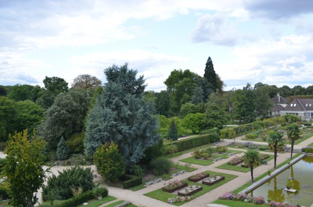 Dans la partie haute, au plus près du bâtiment, on trouve des rosiers sophistiqués (rosiers tiges ou pleureurs greffés en tête par exemple). Dans la partie centrale, des rosiers buisson sont mis en scène dans un quadrillage orné de bancs en bois eux-mêmes conçus par les élèves sur la base d’un quadrillage (planches de bois superposées). Les rosiers sont associés par couleur à des vivaces. En adoptant l’œil d’un paysagiste, vous remarquerez peut-être que les végétaux au centre de la roseraie sont de petite taille et plus votre regard sera latéral, plus les végétaux seront hauts.
